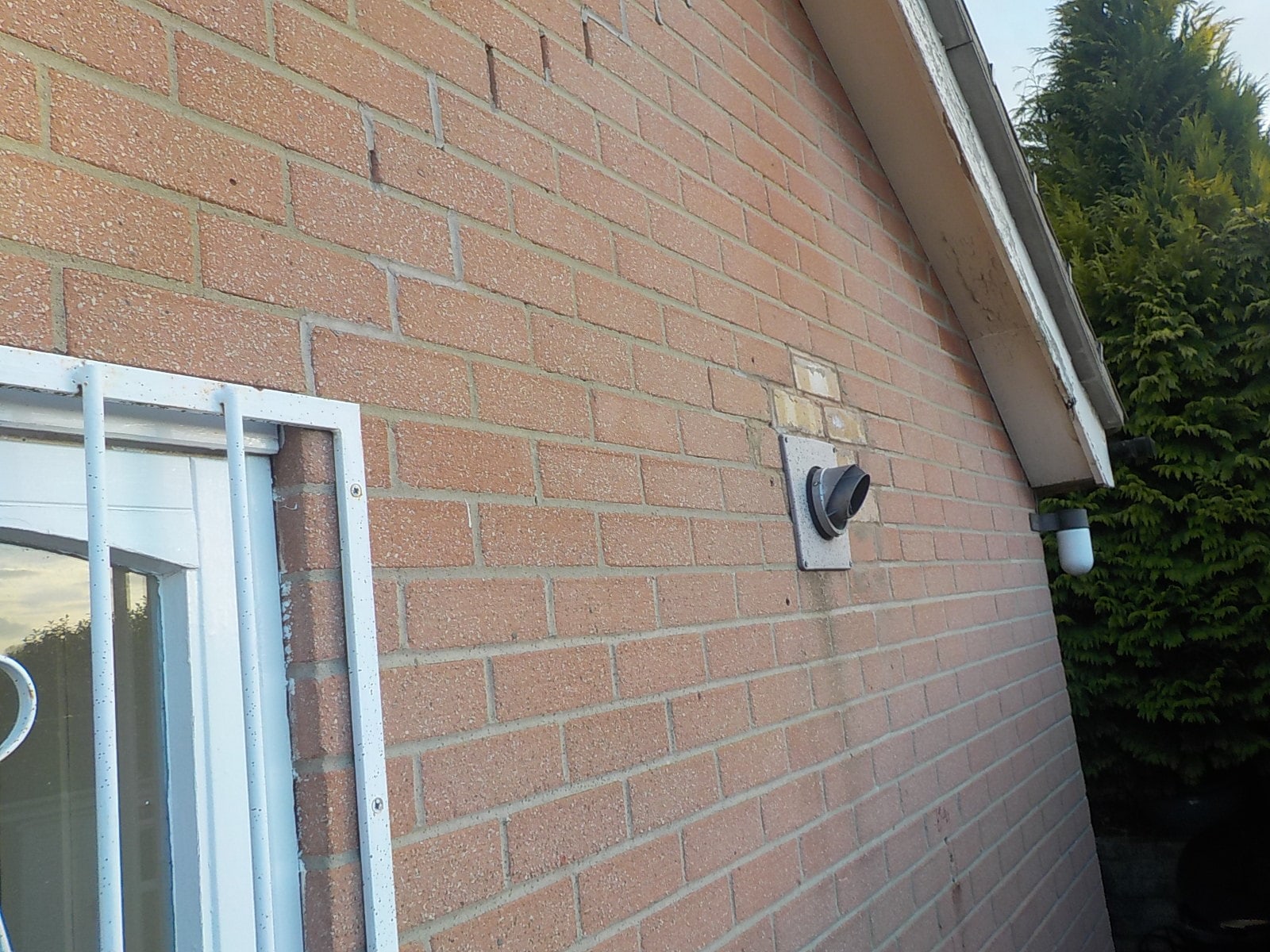 The fracture is vertical in nature, is largely confined to the mortar joints, appears to be entirely above the engineering brick damp proof course from which it runs through the window opening and up to the roof edge. A brick below the window opening appears to have been disturbed. See Photographs 1 and 2.